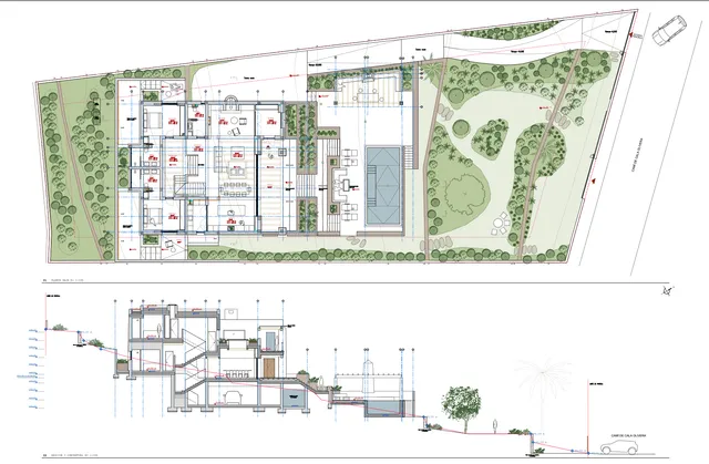À l'intérieur, la villa dispose d'une cuisine ouverte et entièrement équipée qui s'intègre parfaitement au salon et à la salle à manger. Cette disposition ouverte favorise les interactions sociales et tire le meilleur parti de la lumière naturelle. D'autres espaces fonctionnels, tels que la buanderie et le garde-manger, assurent le confort et l'organisation au quotidien. La présence d'un sous-sol ajoute un espace supplémentaire précieux qui, dans ce projet, est complété par une cave à vin, idéale pour les passionnés ou ceux qui aiment recevoir.