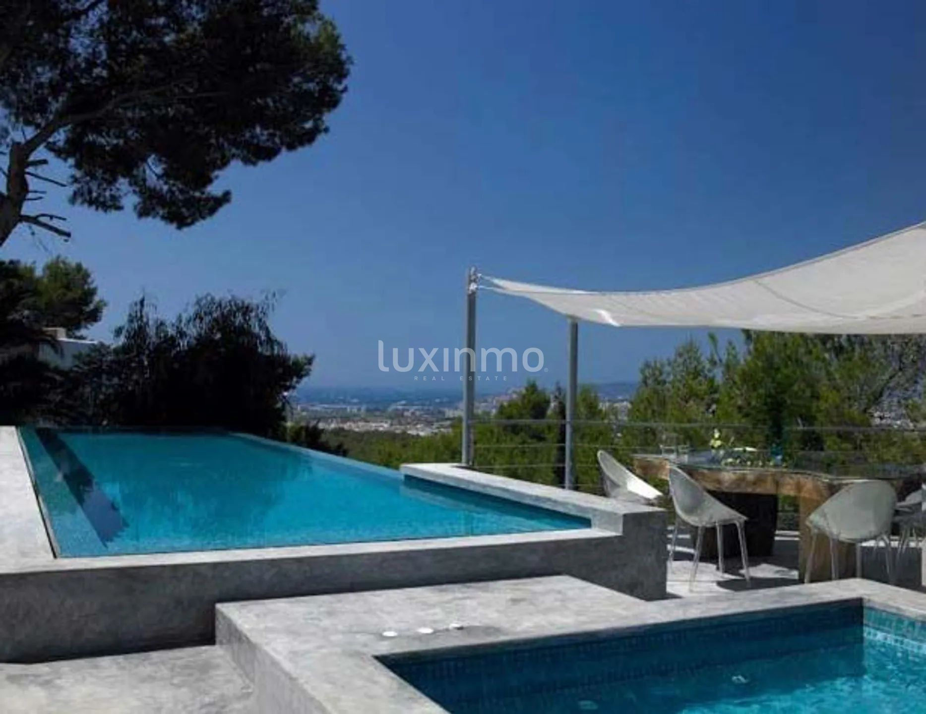Willkommen in der Villa Allure, einem zeitgenössischen Meisterwerk auf dem höchsten Punkt der prestigeträchtigen Wohnanlage Can Furnet. Mit einem atemberaubenden Panoramablick auf das Mittelmeer, Dalt Vila und den Hafen von Ibiza, kombiniert diese Villa Privatsphäre, Luxus und modernes Design in einer der begehrtesten Lagen der Insel.