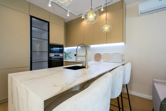 The house is completely renovated, new furniture, new bathrooms, covered garage and garden. The house has 120m2 of living space, consists of 3 bedrooms, one of them a master bedroom with en-suite bathroom and terrace on the first floor and two guest bedrooms, a dressing area or study and a large lounge with open plan kitchen and dining area with access to the terrace. Large modern kitchen with under-lighting and island. Fully equipped with bosch appliances.