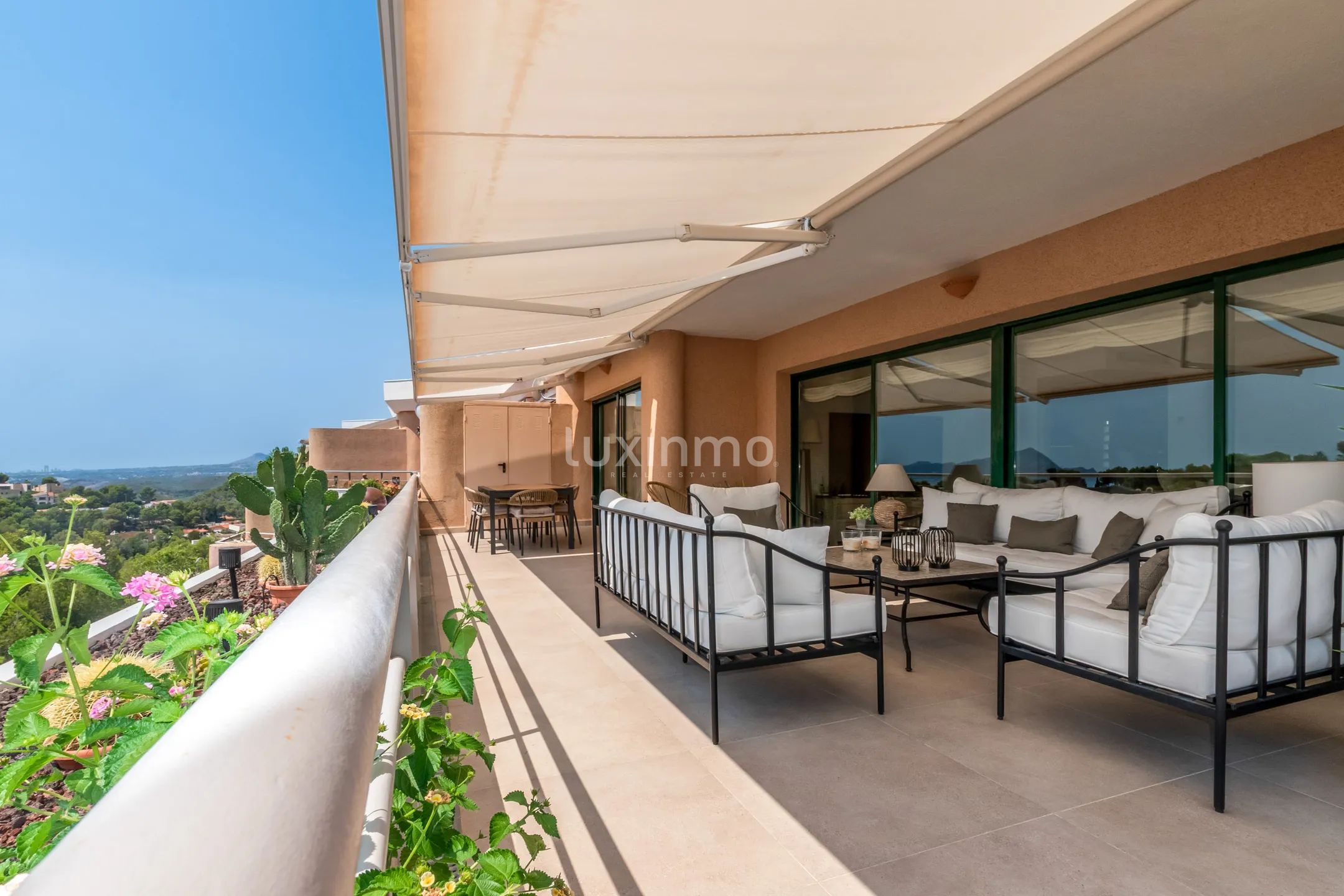La amplia terraza de 60 m2 ofrece un lugar perfecto para disfrutar de las impresionantes vistas y tomar el sol del Mediterráneo. El apartamento cuenta con aparcamiento privado, lo que garantiza la comodidad de los residentes. La cocina americana está bien equipada y cuenta con una zona de lavandería funcional.