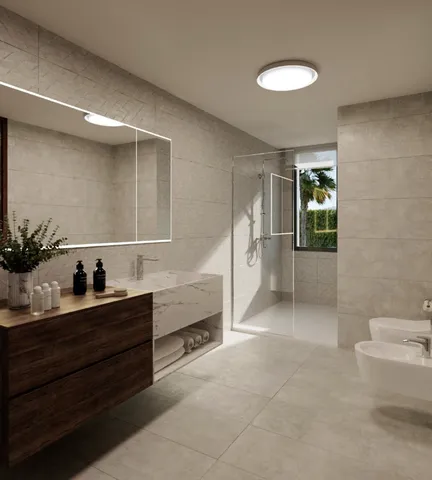 La vie à l'extérieur est mise en valeur par un jardin privé, un espace barbecue et une superbe piscine. La villa est équipée de la climatisation, du chauffage central et du chauffage par le sol pour un confort tout au long de l'année. La domotique de pointe et les panneaux solaires garantissent l'efficacité énergétique et les capacités de la maison intelligente.