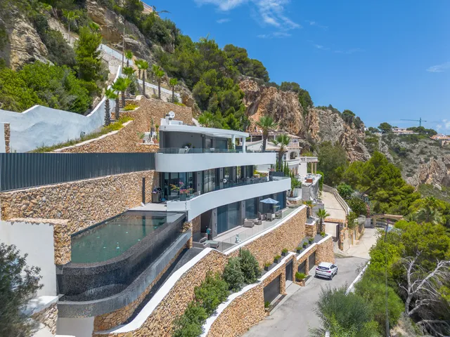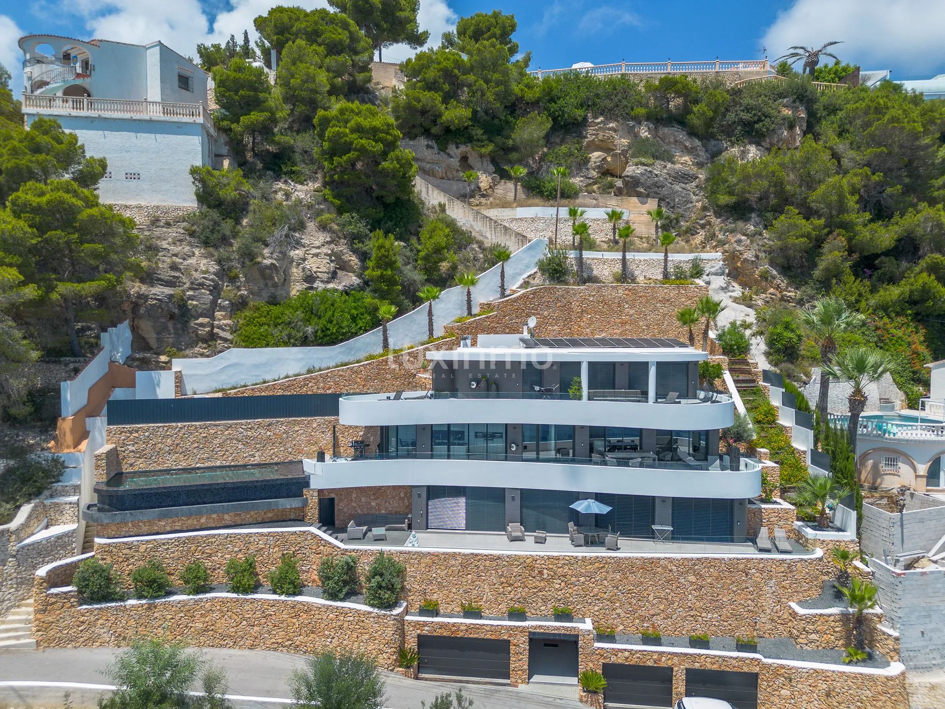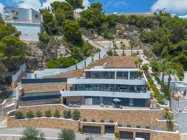 This modern villa is located in a cul-de-sac which gives it a very quiet location on the first line to the sea, Javea is recognized as a jewel of Costa Blanca which thanks to its gastronomy and excellent climate, with more than 320 days of sunshine a year, has been internationally recognized as an ideal place for lovers of mountain routes and water sports. The villa is close to the city centre, as well as the harbour and beautiful beaches. In the town you can find all necessary infrastructure such as hospitals, schools, sports and shopping centres, restaurants and other places for excellent leisure activities. The villa is located exactly in the centre, between the two biggest cities of the region, Alicante and Valencia, each of which has its own train station and the airport.The international airport can be reached in just one hour and twenty minutes by car.