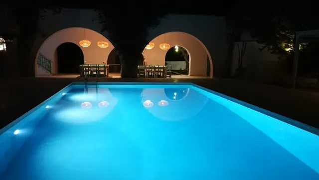 Op de begane grond vinden we de woonkamer, grote hal, TV salon en ontspanningsruimte. Buitenzwembad met brede stranden, aangebouwde rustruimte, overdekt terras-eetkamer met barbecue en houtoven, toilet en schoonmaakruimte, machinekamer en put voor irrigatiewater. Grote tuin met buiten gazebo. Op de eerste verdieping zijn de slaapkamers.