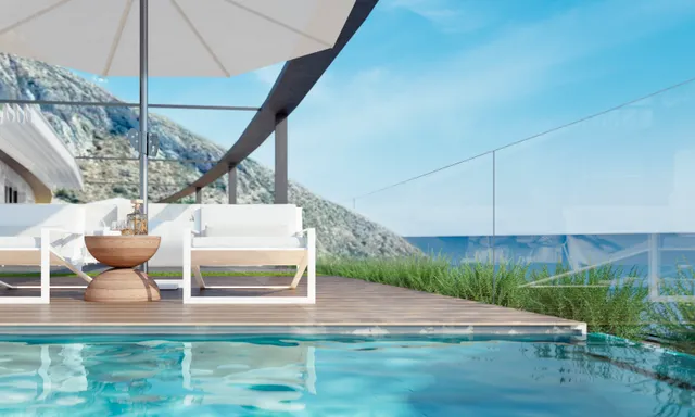 Et privat svømmebasseng i hver av boligene er en oase hvor man kan slappe av og kjøle seg ned på varme sommerdager.