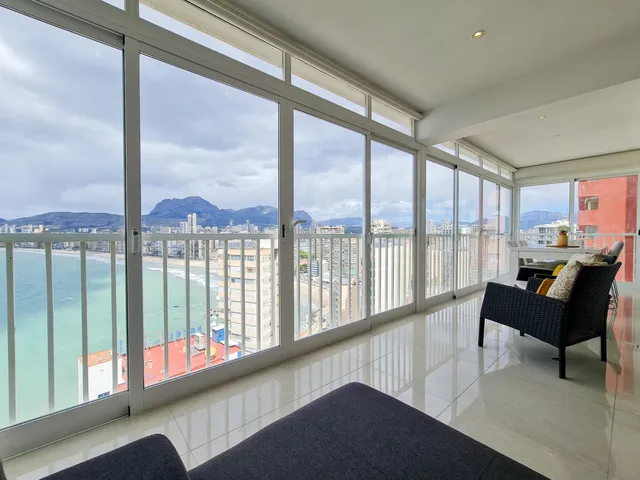 Vakker leilighet i syvende etasje med utsikt over havet og byen Benidorm. Leiligheten består av et hovedsoverom med stor seng, garderober og utgang til en innglasset terrasse, et annet soverom med en køyeseng med 2 senger og garderober og et bad. Det åpne kjøkkenet vender ut mot stuen, som igjen fører ut til en innglasset terrasse med vakker havutsikt. Leiligheten er fullt møblert og klar til å bo i et moderne miljø, kun 5 minutter fra stranden. Leiligheten har felles parkering og felles svømmebasseng.