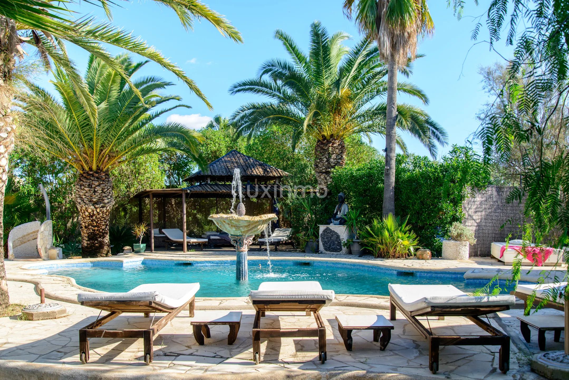 Особняк с его сад и бассейн расположены на востоке, юге и западе с видом на внутреннюю часть острова и видом на океан. Дом находится в 10 минутах езды от аэропорта. До города Ибица 15 мин. И 15 минут до лучших песчаных пляжей острова, таких как Salinas, Playa d 'en Bossa с Ushuaia и его Beach clubs, Sa Caleta, Cala Yondal с Blue Marlin, Cala D'Hort и др.