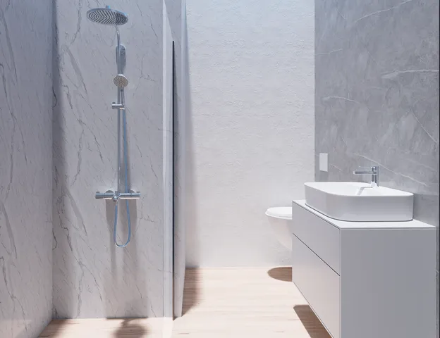 Дизайнерская белая сантехника высшего качества, умывальники - столешницы, мебель в ванной комнате - подвесная.