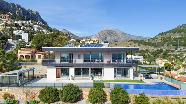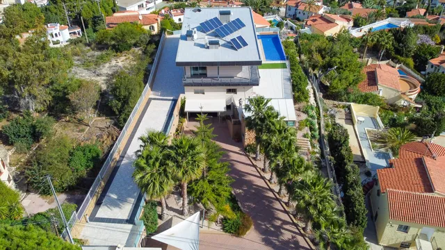 На главном этаже мы найдем большой салон с двойным светом и высоки потолком, объединяющийся с кухней из которой вы можете попасть на дополнительную кухню. Так же гостевой туалет и спальня с видом на море со своей ванной и гардеробной. На втором этаже большой открытый кабинет. Так же там есть три спальни и каждая со своей ванной комнатой и две из них с выходом на террасу откуда открывается вид на море и знаменитую гору Ифач. В нижней части дома расположен большой гараж на 3 автомобиля и гостевой апартамент, а так же ванная комната, винный погреб, и дополнительная гардеробная.