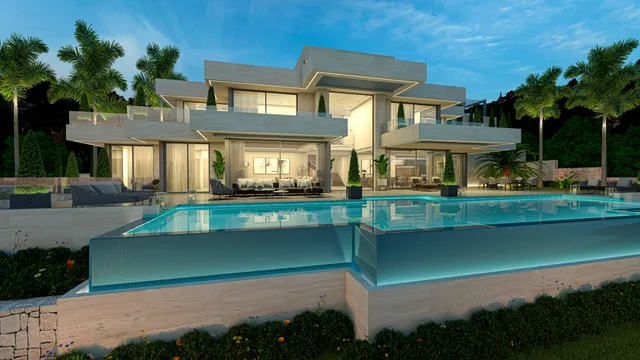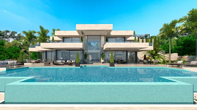 Проект эффектной современной двухэтажной виллы с подвалом на участке в Хавеа рядом с Кабо ла Нао с панорамным видом на море.