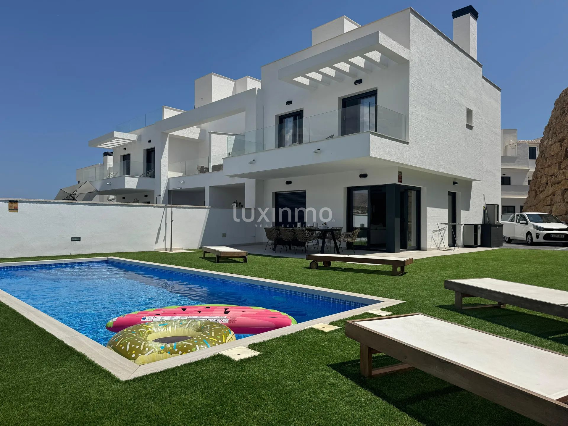 Дом с тремя просторными спальнями и тремя ванными комнатами расположен на нескольких уровнях и отделан с тщательностью и элегантностью. В доме есть три балкона, солнечный солярий и частная терраса с собственным бассейном - идеальное место для отдыха, развлечений и круглогодичного наслаждения средиземноморским климатом. Также в стоимость входит частное парковочное место.