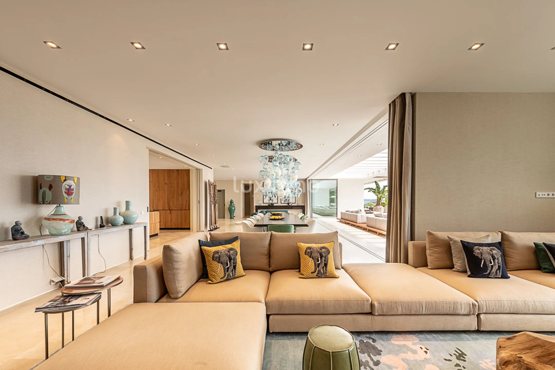 Vi är glada att kunna presentera en av Ibizas mest exklusiva egendomar på bergstoppar. Elephant Hills har en verkligt privilegierad miljö, uppflugen på toppen av sitt eget privata berg på öns östkust. Detta exceptionella läge erbjuder fullständig avskildhet samtidigt som det förmedlar en extraordinär känsla av öppenhet och frihet. Byggd enligt högsta standard och omgiven av frodiga tropiska trädgårdar, har varje detalj i denna magnifika fastighet noggrant övervägts. Från handvalda material till det senaste inom avancerad hemteknik levererar villan en kompromisslös nivå av kvalitet och sofistikering. Fastigheten har hisnande soluppgångar och svepande panoramautsikt över bergen och havet. Naturligt ljus flödar in i interiören genom eleganta Vitrocsa minimalistiska fönster, designade med rena linjer och maximal transparens. De expansiva glaspanelerna har nästan osynliga ramar och blandar sömlöst inomhus- och utomhusutrymmen. På bottenvåningen står ett fantastiskt designkök i centrum, fullt utrustat med premiumapparater från Gaggenau, Miele och Smeg. Det generösa vardagsrummet rymmer bekvämt gäster, oavsett om de kopplar av vid den raffinerade eldstaden - komplett med en dold smart-TV med plattskärm - eller samlas runt den imponerande matplatsen. När de stora fönsterpanelerna öppnas flyter interiören enkelt ut på den yttre terrassen, vilket skapar en enhetlig och expansiv livsmiljö. På detta plan finns också två distinkta flyglar. Den vänstra flygeln har en privat hall som leder till den första master-sviten och en juniorsvit. I den högra flygeln finns en andra master-svit, ytterligare en juniorsvit och en gästtoalett. Detaljer om fastigheten: Tomtstorlek: 61.375 m². Byggd yta: 2,331 m² Interiör boyta: 1.125 m². Sovrum: 6 (alla med eget badrum) Plats: Område Santa Eulalia, Ibiza