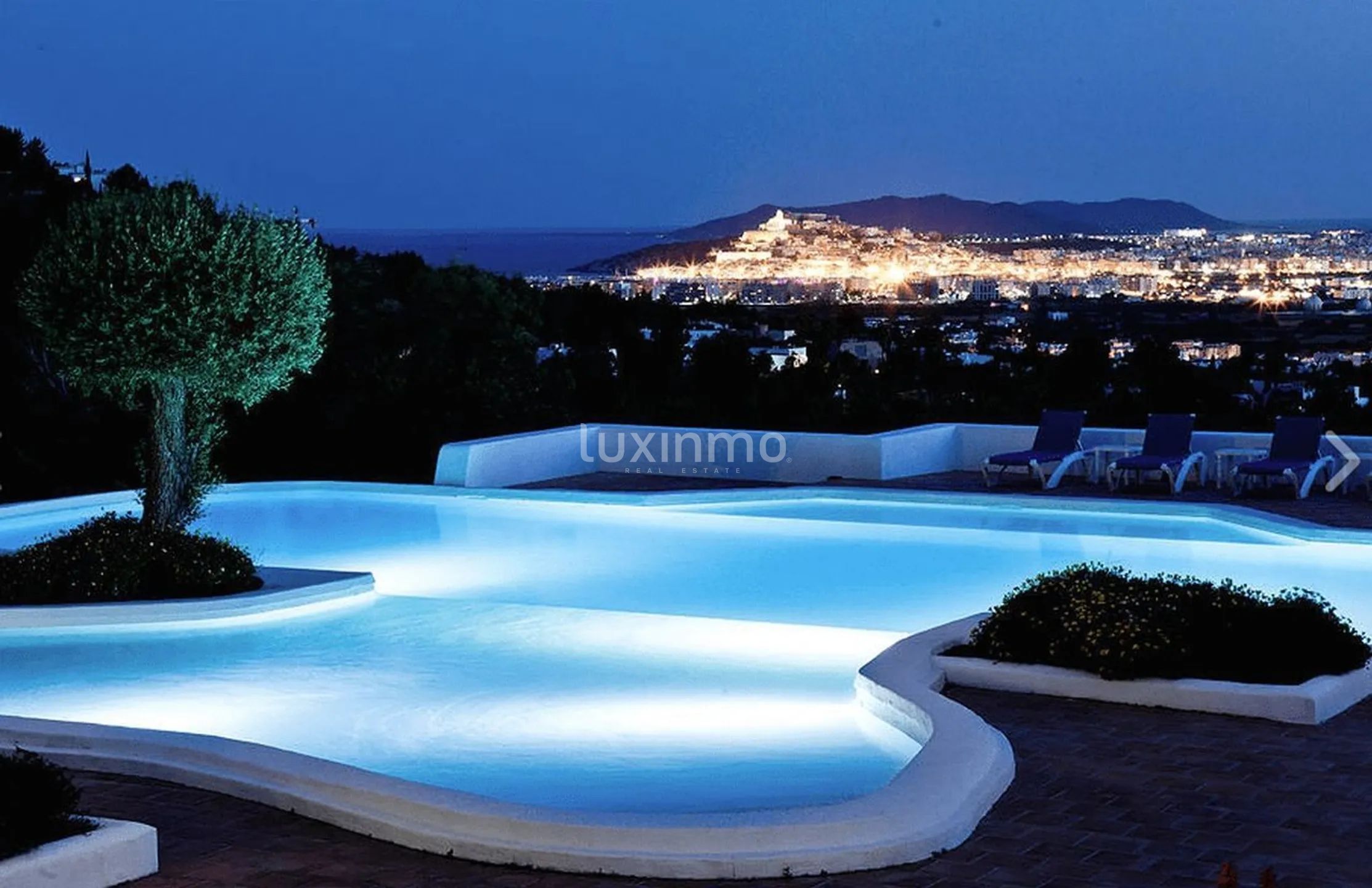 This villa is a totally renewed traditional villa, located in a secluded quiet area with a private drive secured by an electronic gate. It has sensational views to Formentera, Ibiza and the harbour. By car it is fifteen minutes to the airport and five minutes to Ibiza Town and the harbour area (Marina Botafoch).